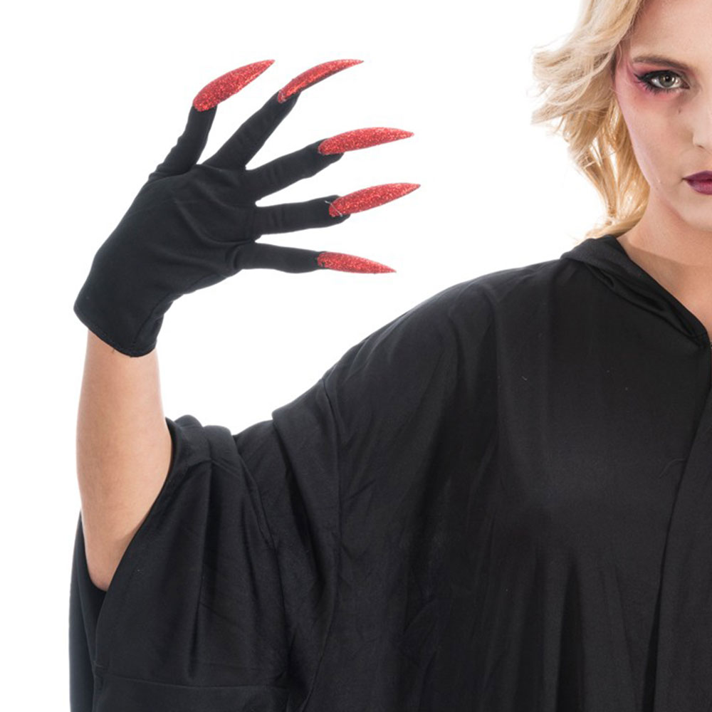Handskar med Röda Naglar omfattar ett par svarta maskeradhandskar med långa naglar i glittrig röd.