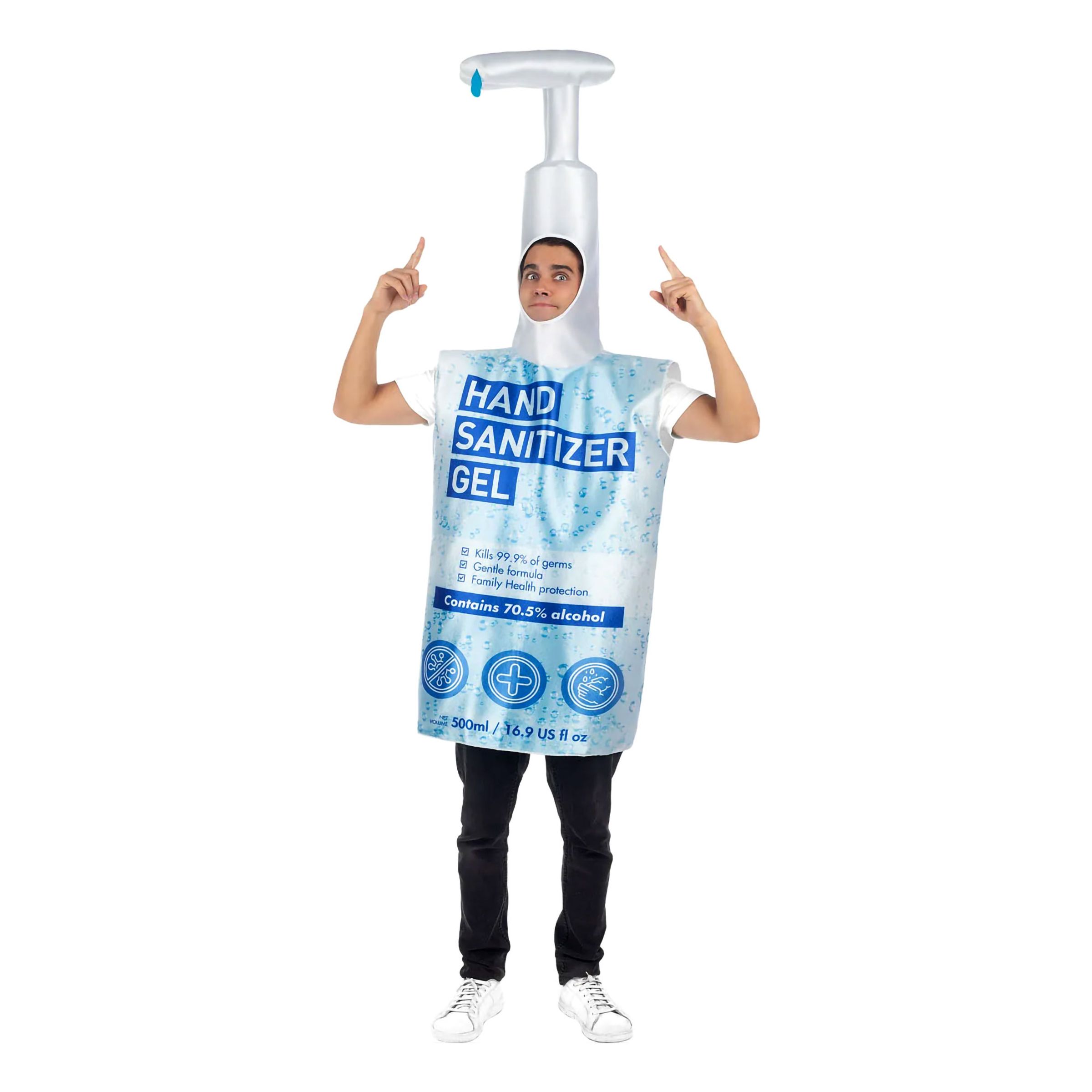 Handsprit Maskeraddräkt består av en tunika utformad som en flaska handsprit, komplett med ett uppstickande dispenserhuvud. Dräkten har öppningar för armar, ben och ansikte och finns i en storlek som passar de flesta vuxna.