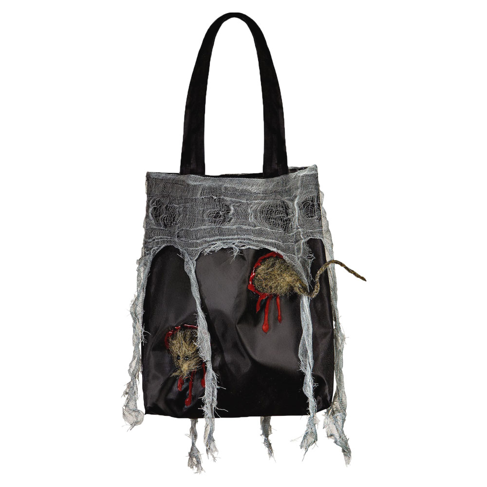 Handväska Råtta omfattar en svart handväska som är dekorerad med spindelnät och en läskig råtta. Väskan är tillverkad av polyester och bomull.