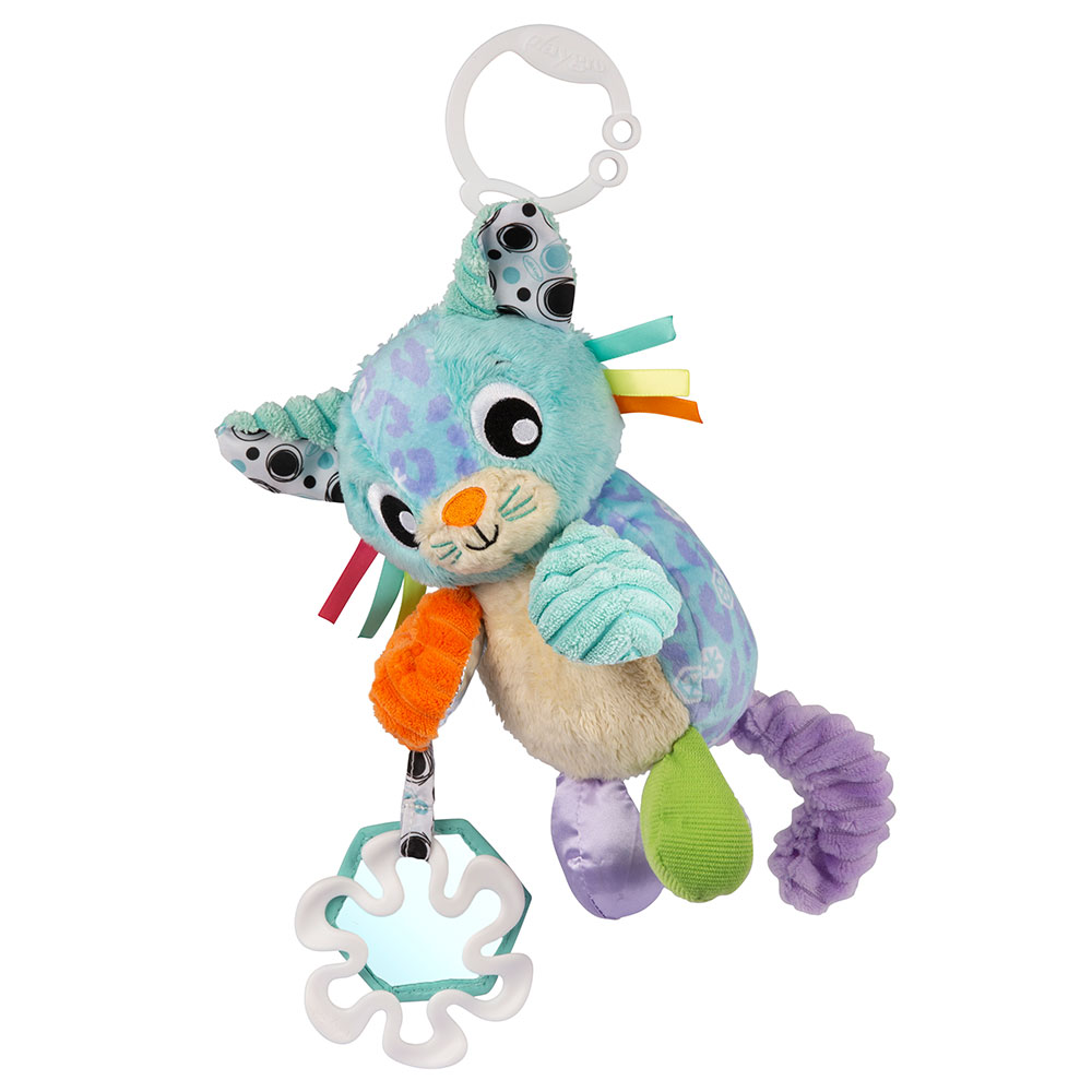 Upptäck denna fantastiska leksak för bebisar som är en aktivitetsleksak i form av en katt med bitleksak och skallra, perfekt för att fästa i barnvagn eller bilbarnstol, vilket erbjuder en underhållande upplevelse för ditt barn under resan.