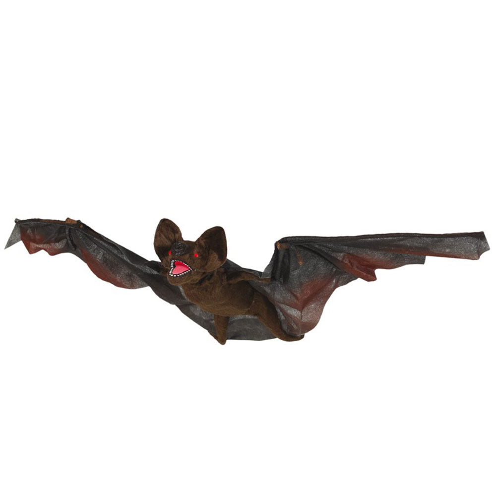 Upptäck den ultimata hängande halloween-rekvisitan i form av en animerad fladdermus på 90 cm som har rörliga delar och inbyggda LED-lampor i ögonen. Fladdermusen är färgad i brunt och svart, och är en perfekt dekoration för halloween.