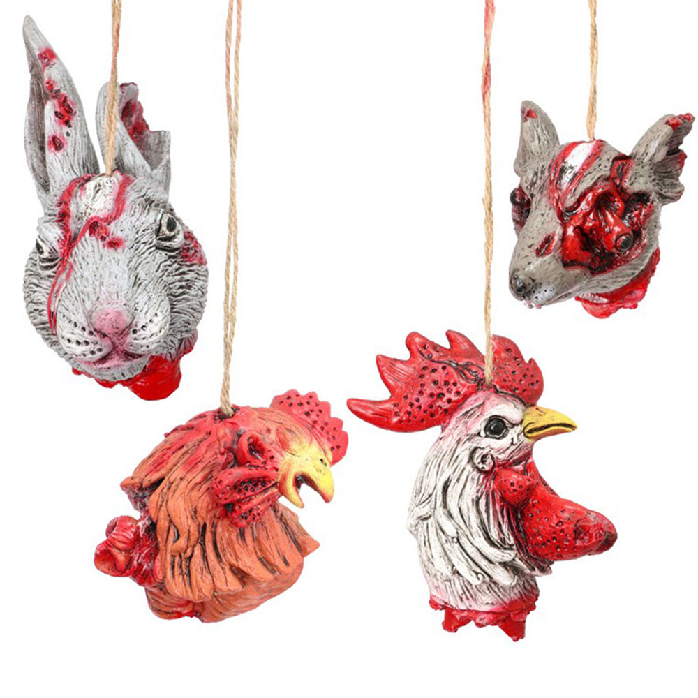 Hängande Dekoration Djurhuvud omfattar en hängande blodig dekoration i form av antingen huvudet av en höna, en tupp, en kanin eller en mus.