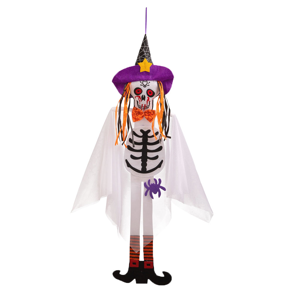 Hängande Dekoration Skelett Häxa Vit omfattar en hängande dekoration föreställandes ett skelett i häxhatt med en spindelnätsmönstrad fluga, randiga strumpor och snabelskor samt spöklikt tyg. Figuren är gjord i polyester och är ca 95 cm lång.