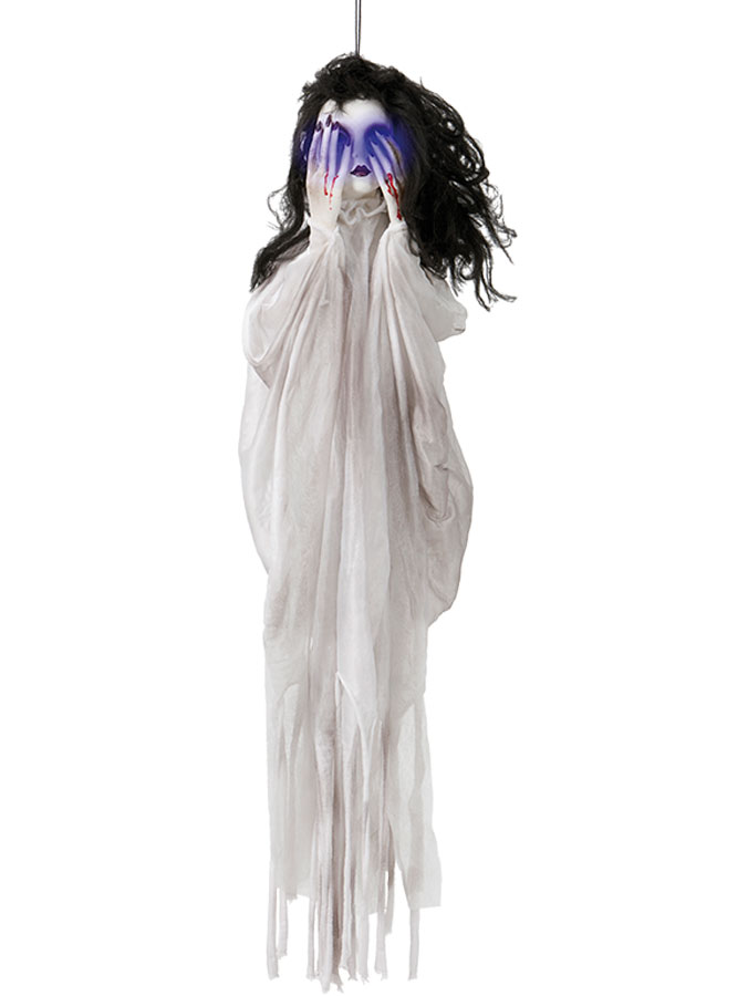 Hängande Dekoration Spökflicka omfattar en detaljrik spökflicka med medellångt svart hår samt en vit halvsliten robe. Spökflickan håller för ögonen med sina blodiga händer och kommer med inkluderande hänganordningar.