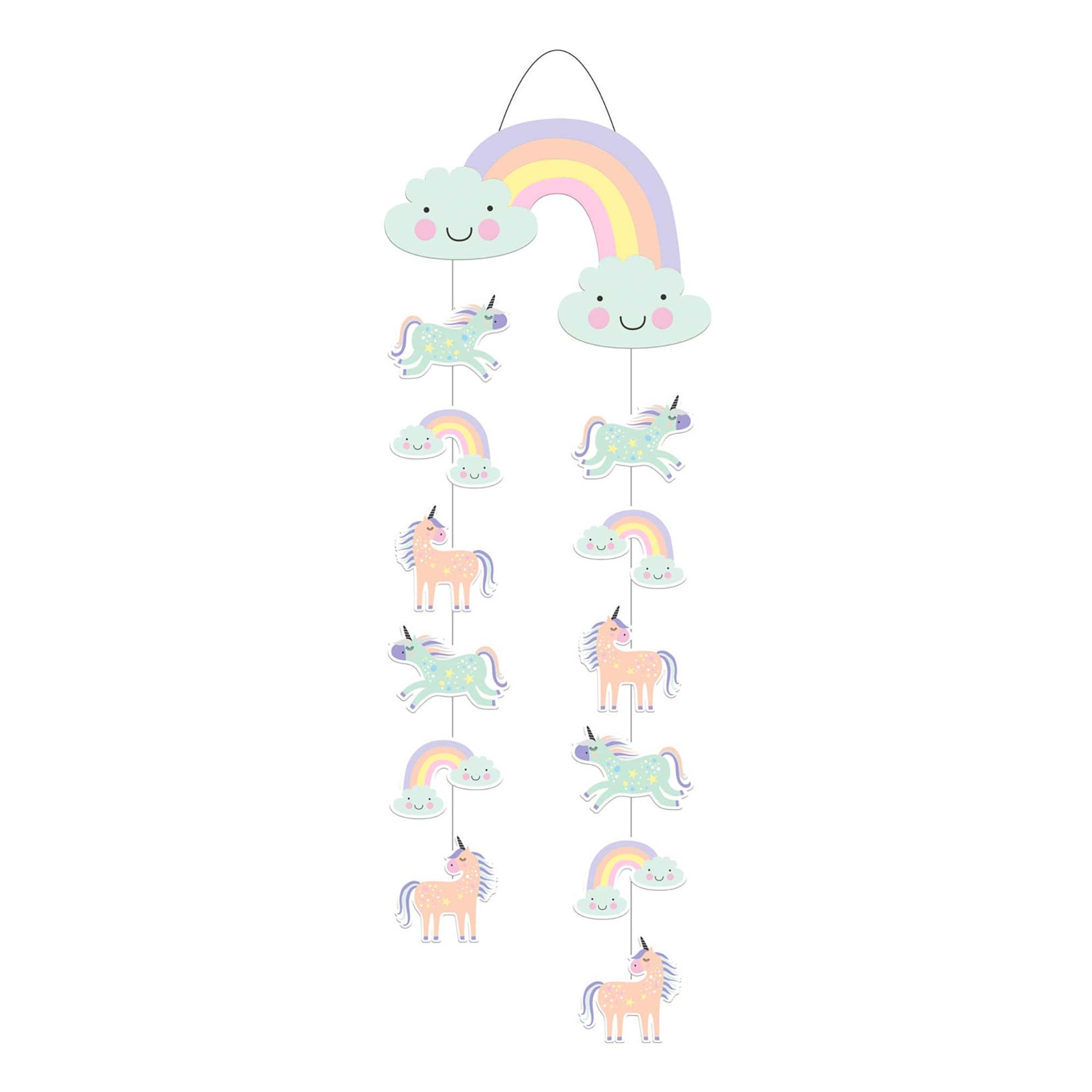 Hängande Dekoration Unicorns & Rainbows mäter 30 x 85 cm och är tillverkad i papper. Perfekt pynt på kalas och andra festliga evenemang!