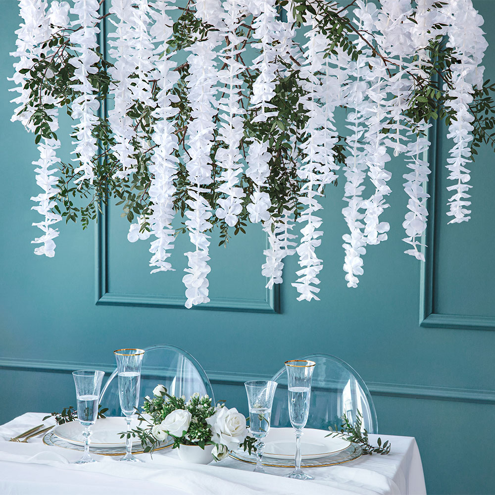 Hängande dekoration för alla festliga tillfällen! Riktigt snygg girlang med fina blommor i vitt som du kan dekorera med på många olika sätt. Du kan exempelvis låta den hänga ner från taket eller kanske sätta upp den över kalasbordet. Kombinera den gärna med flera matchande blomgirlanger för en stor, och riktigt imponerande festdekoration med massor av vackra blommor.