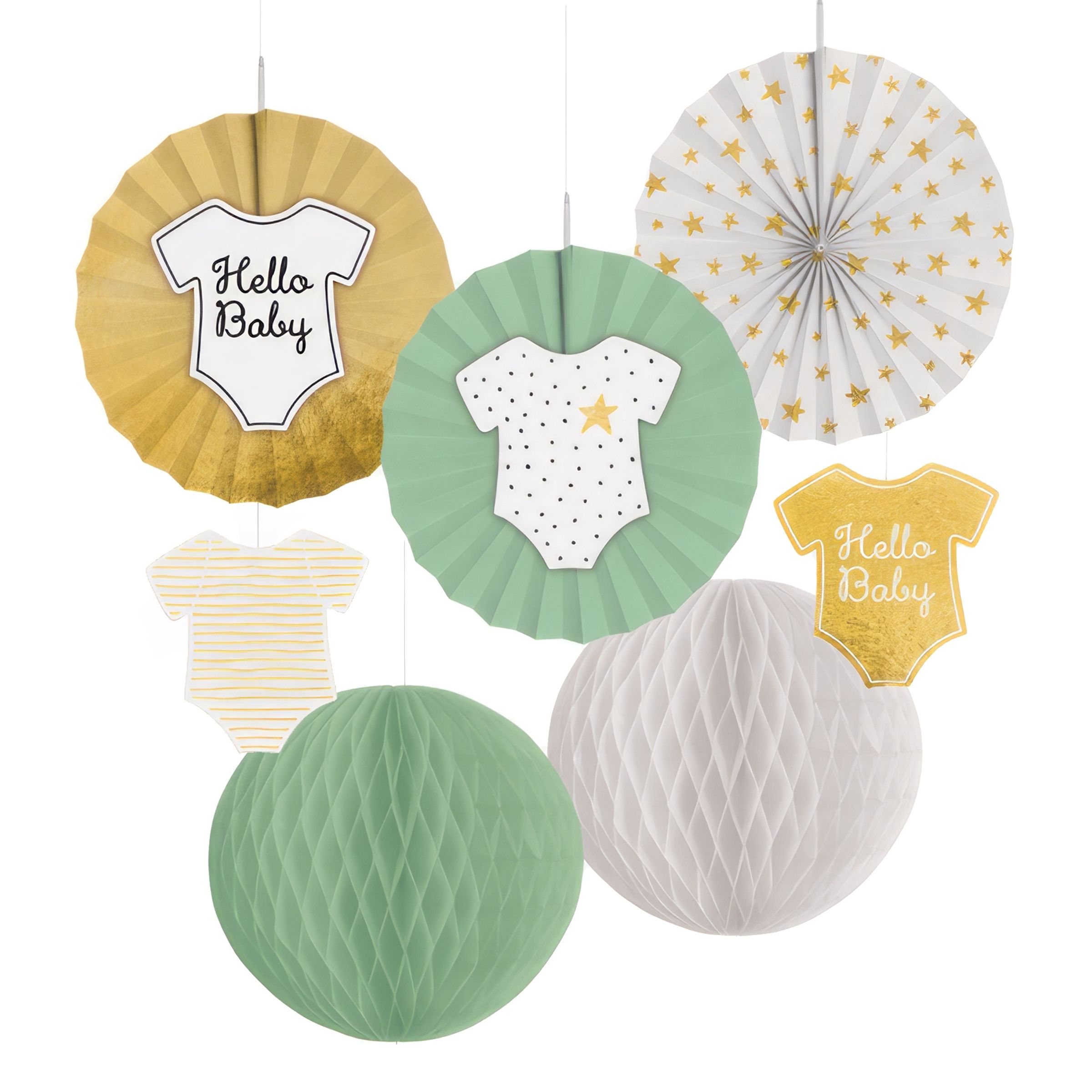 Hängande Dekorationer Hello Baby inkluderar fem stycken hängande dekorationer med 3 stycken pappersfjädrar och två stycken honeycombs i gröna, vita och guldiga färger. Perfekt till Baby Showern!