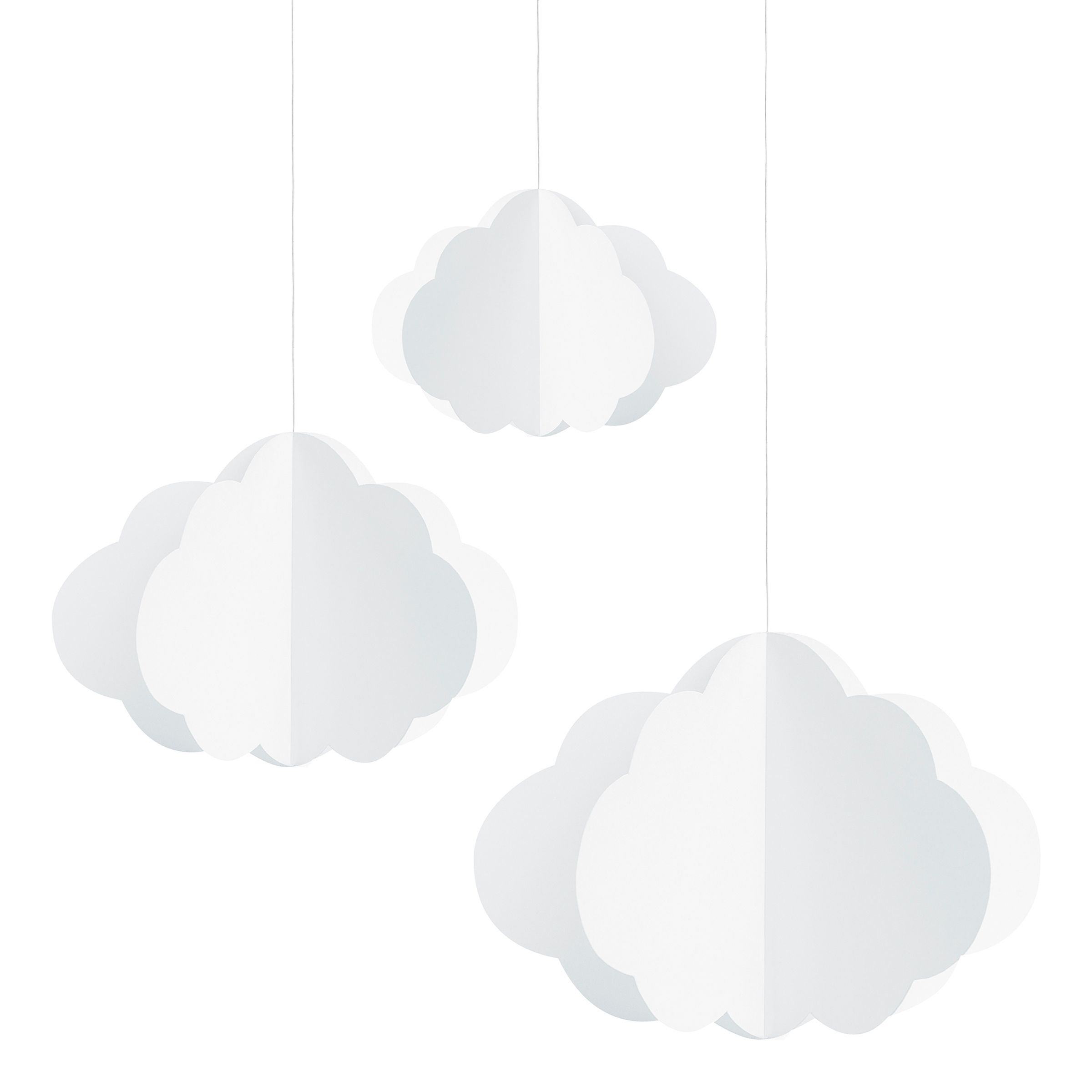 Hängande Dekorationer Moln inkluderar tre stycken pappersdekorationer i form av små moln som du fäster upp i taket. En fin inredningsdetalj till barnrummet likväl som till Baby Showern!