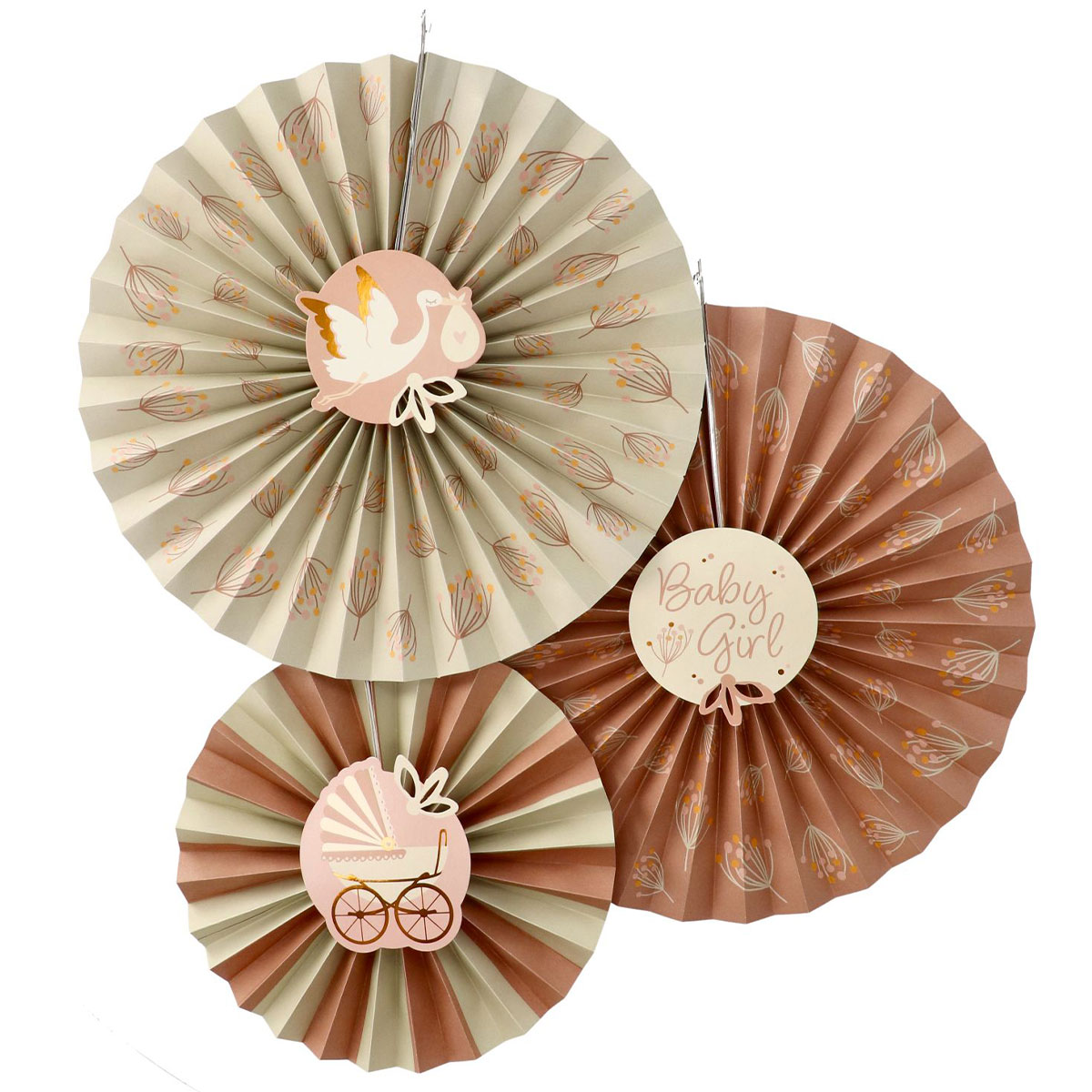 Hängande Dekorationer Solfjäder Baby Girl 3-pack består av tre hängande dekorationer i form av solfjädrar: en liten randig i beige och rosabrun samt två stora i rosabrun eller beige med blomknoppar. Dessutom ingår tre pappersdekorationer som fästs i mitten av solfjädrarna: en rosabrun med en vit stork, en gammelrosa med en barnvagn och en beige med texten "Baby Girl". Ett vitt snöre medföljer för enkel upphängning.