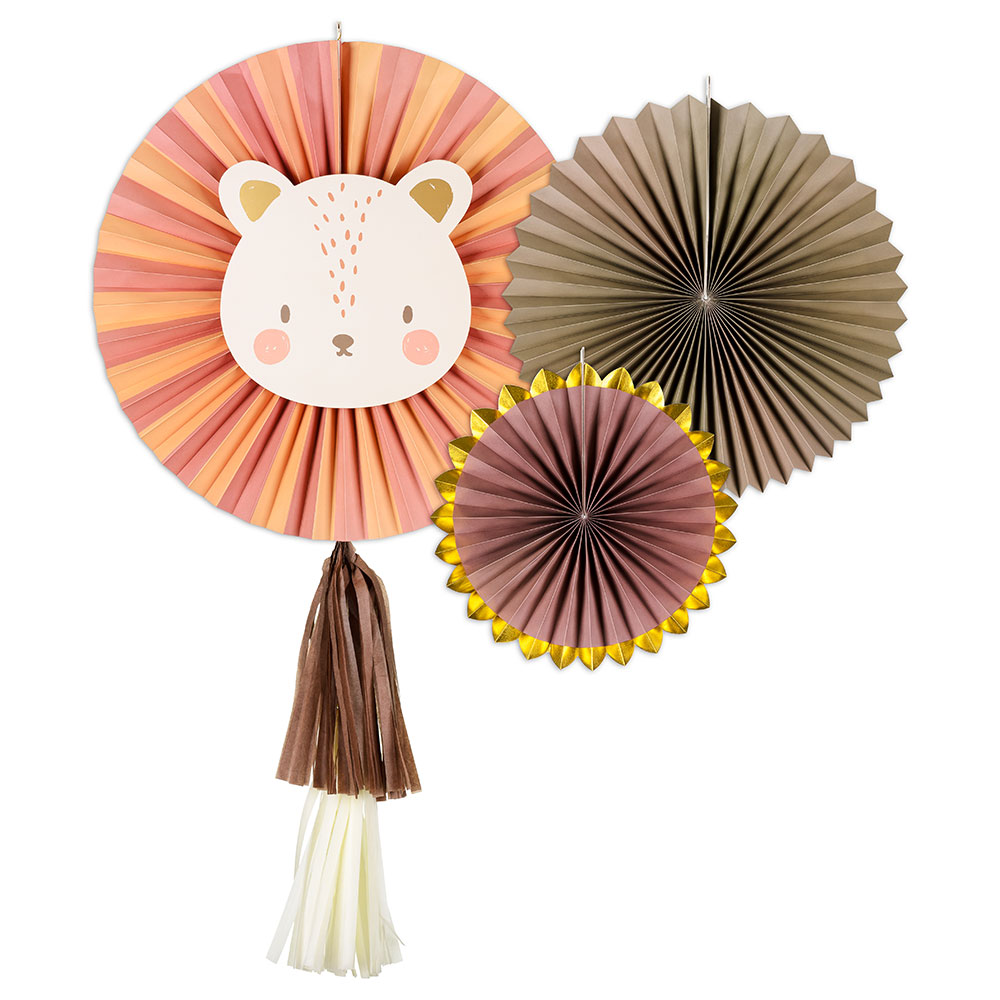 Dekorera ditt hem med våra fantastiska Hängande Dekorationsrosetter Lejon! Dessa pappersdekorationer är perfekta för att förvandla varje rum till en färgstark djungel. Dessa rosetter är avbildade med lejon och kommer att tillföra en lekfull och exotisk touch på varje fest eller tillställning. Dessa dekorationer är lätta att hänga upp och är en garanterad eye-catcher! Använd dem för födelsedagsfester, barnrum, temaevenemang eller bara för att göra din vardag extra speciell!