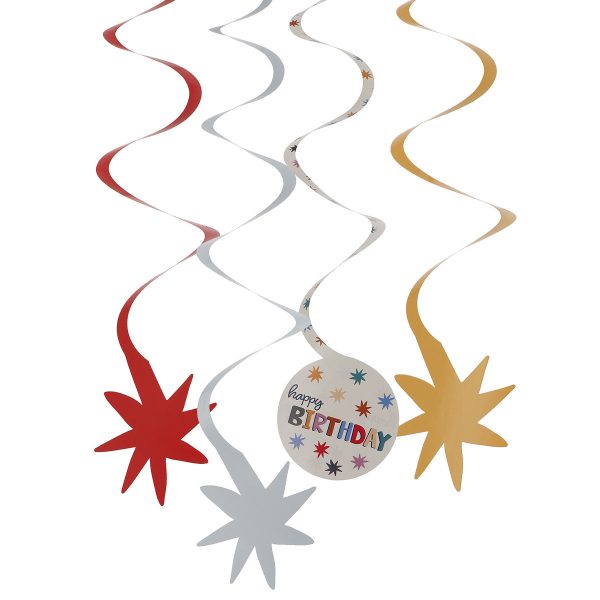Hängande Födelsedagsdekorationer med Stjärnor 6-pack omfattar hängande födelsedagsdekorationer i form av sex virvlar, varav tre har stjärnor och tre har runda hårdpappdekorationer med texten "Happy Birthday" och stjärnor i svart, blått, grönt, orange, rött, brunt och rosa mot en vit bakgrund.