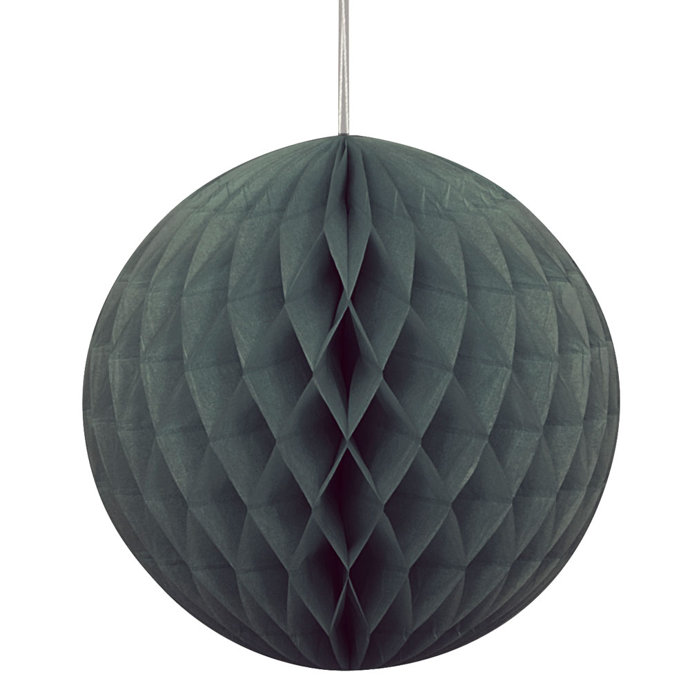 Hängande Honeycomb Boll svart innehåller en rund, svart honeycomb. Honeycomben viks enkelt ut och hängs sedan upp i det lilla snöret. Dekorationen är tillverkad av papper.