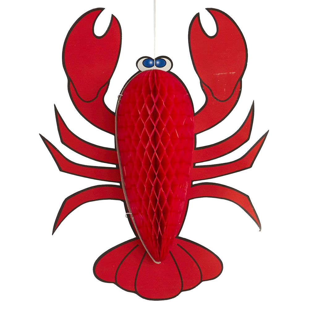 Hängande Honeycomb Kräftskiva omfattar en hängdekoration i form av en kräfta i rött och vitt med blå ögon. Dekorationen är gjord i papp med tillhörande tygsnöre som gör den enkel att hänga upp. Vik ut fram och baksida på kräftan och fäst med medföljande gem.