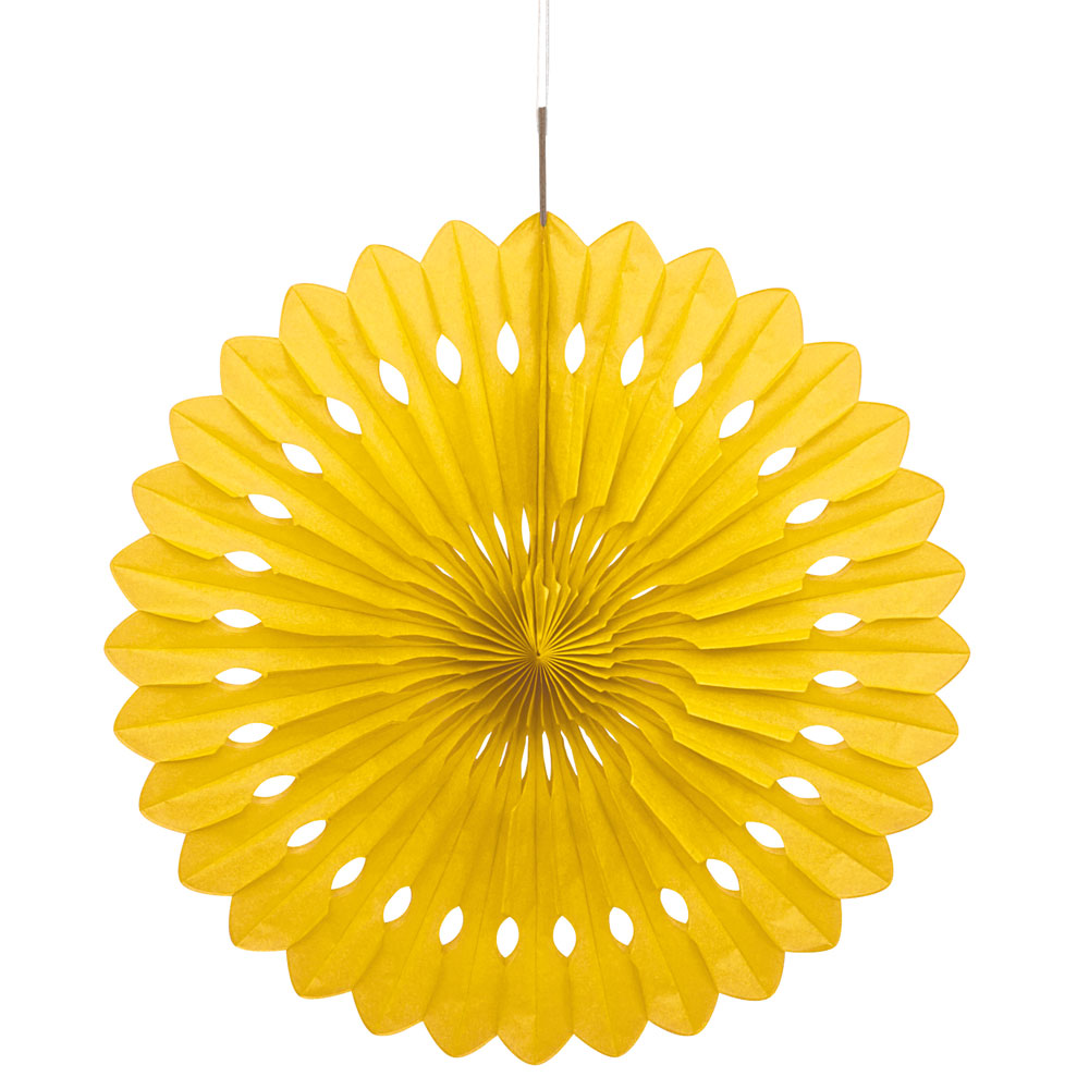 Hängande Honeycomb Solfjäder Gul består av en solfjäderformad honeycomb dekoration i gult. Vik ut dekorationen och upp den på din fest eller i ditt hem. Dekorationen är tillverkad i papper.