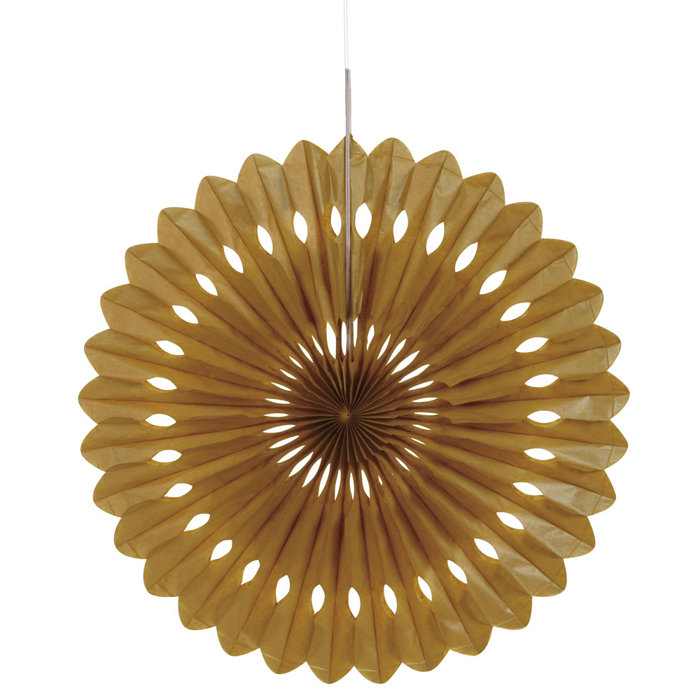 Hängande Honeycomb Solfjäder Guld består av en guldig honeycomb i solfjäder form. Honeycomb dekorationen viks enkelt ut och hängs sedan upp i det lilla snöret. Dekorationen är tillverkad i papper.