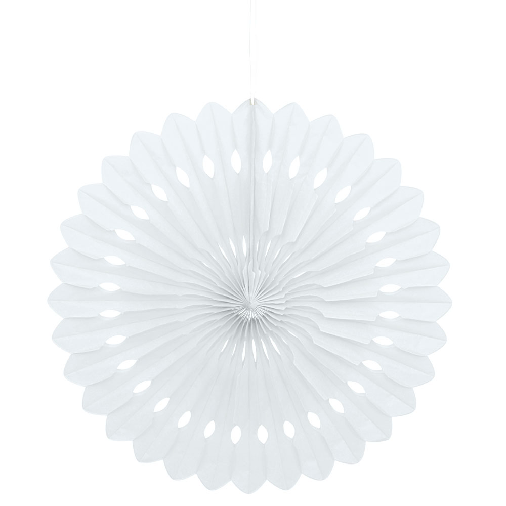 Hängande Honeycomb Solfjäder Vit är en vit honeycomb som enkelt viks ut till solfjäder form och sedan hängs upp som snygg dekoration i hemmet eller på olika firanden och kalas. Honeycomb dekorationen är tillverkad i papper.