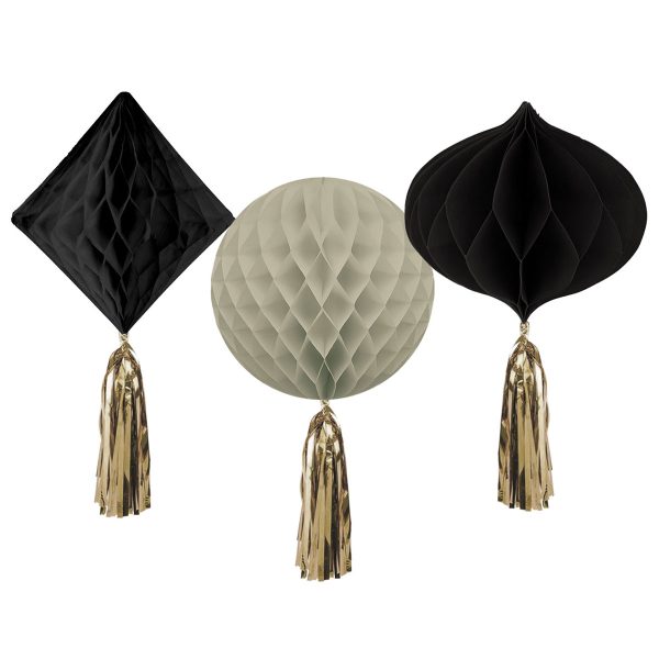Hängande Honeycombs Svart/Krämvit 3-pack består av hängande pappersdekorationer i form av tre olika honeycombs med guldiga tofsar, varav två är svarta och en är krämvit. Ett vitt snöre medföljer för enkel upphängning.