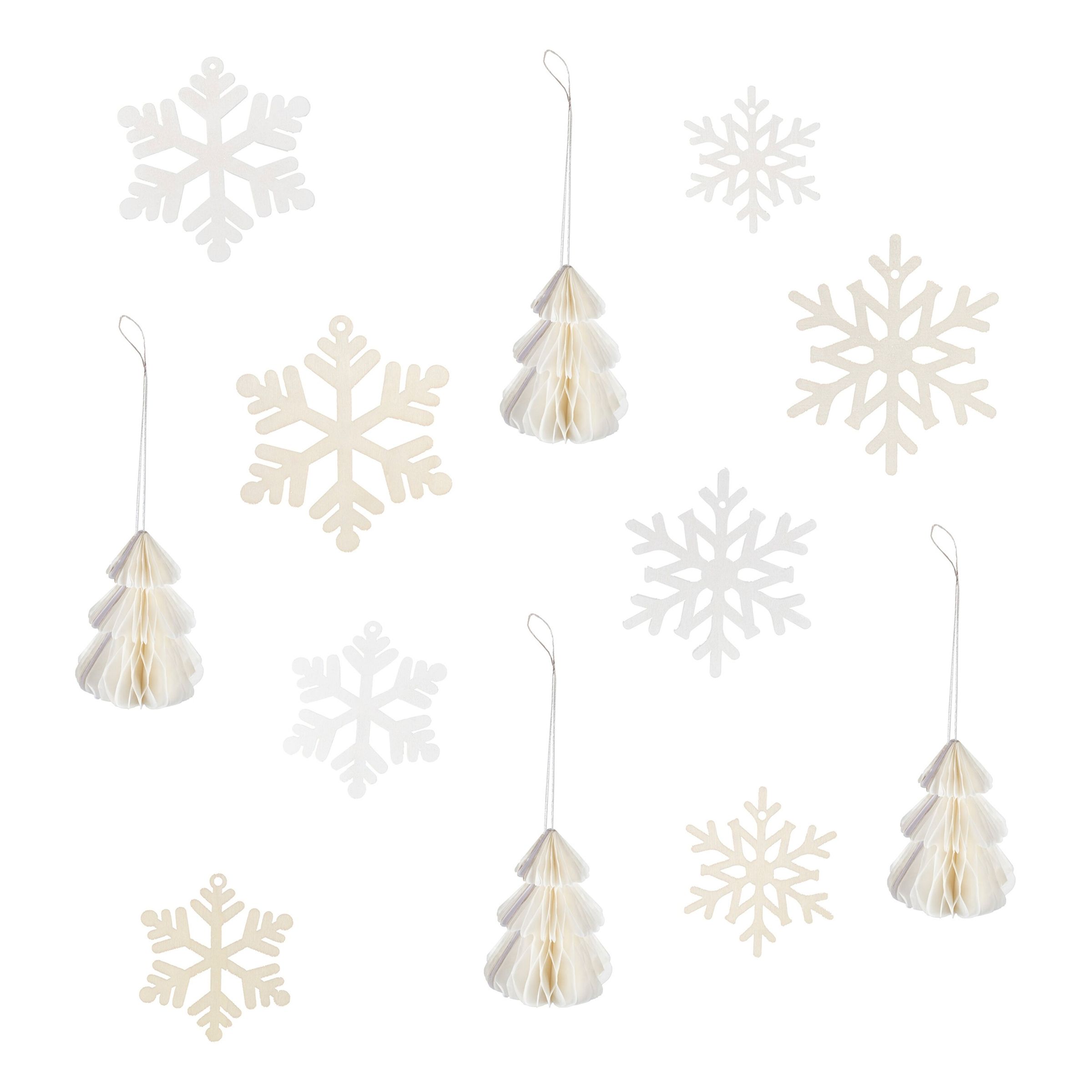 Hängande Juldekorationer inkluderar tolv stycken trevliga dekorationer i form av små vita granar av papper, samt snöflingor av trä i olika storlekar. Medföljer gör även tråd för så att du enkelt själv kan knyta egna hängen.