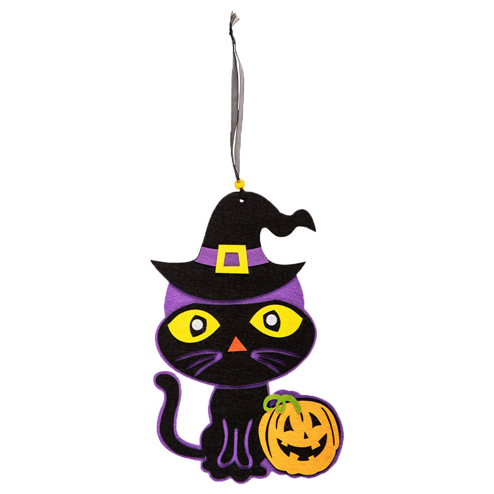 Hängande Katt i Filt omfattar en hängande dekoration föreställande en svart katt på lila bakgrund med en häxhatt och en pumpa. Dekorationen är gjord i filtad polyester och är ca 25 cm lång utan och 38 cm med snöret.