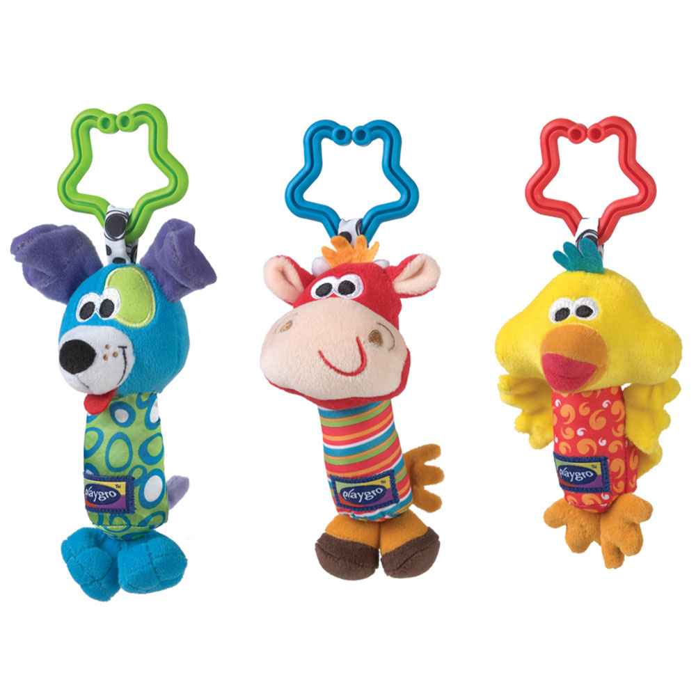 Hängande Leksaker Djur 3-pack omfattar ett set med tre hängande aktivitetsleksaker i form av en kyckling, en mus och en ko. Varje leksak har en stjärnformad krok i grön, röd eller blå för enkel upphängning.