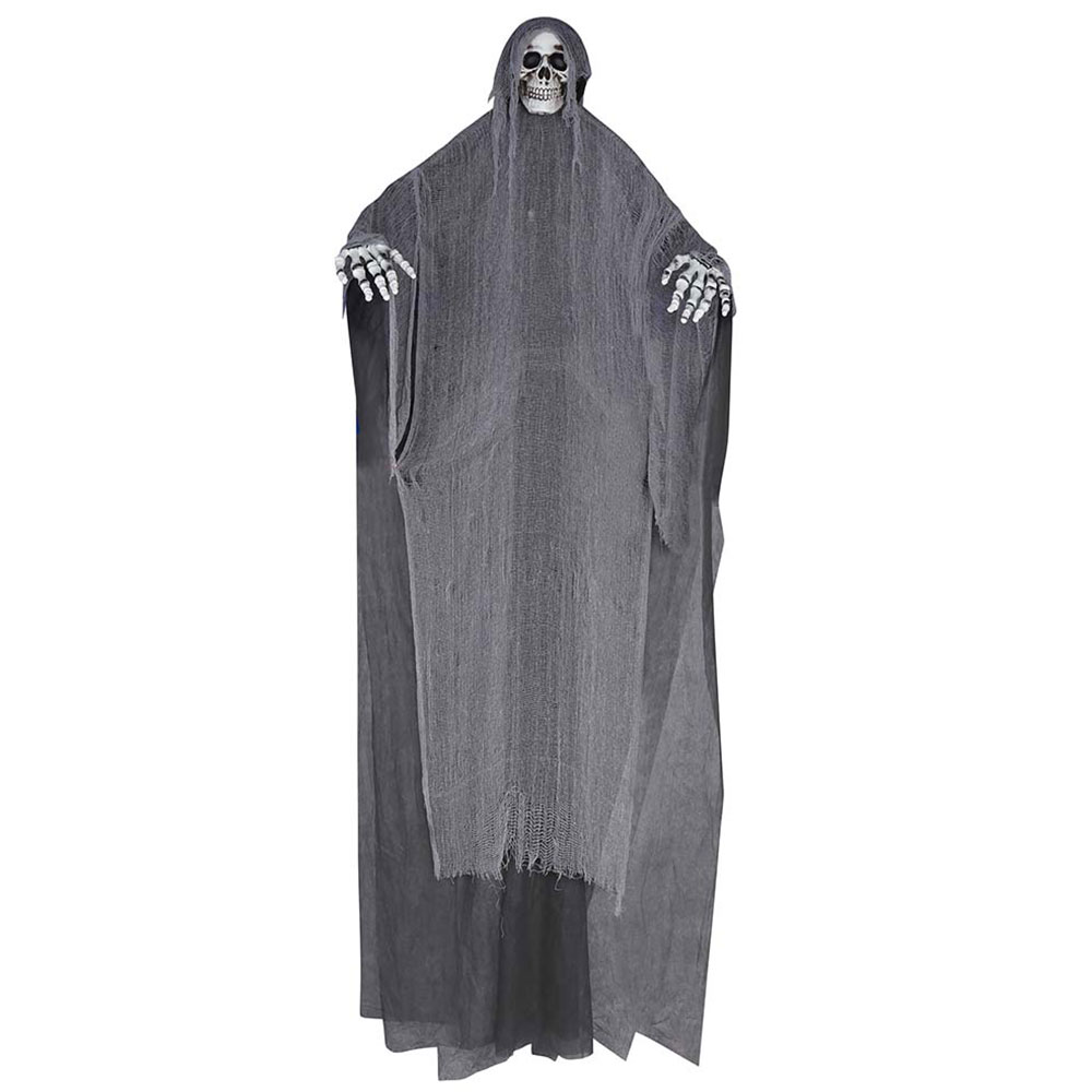 Hängande Liemannen 320 cm omfattar en hängande dekoration i form av ett skelett med en vit dödskalle och armar, klädd i en grå dräkt.