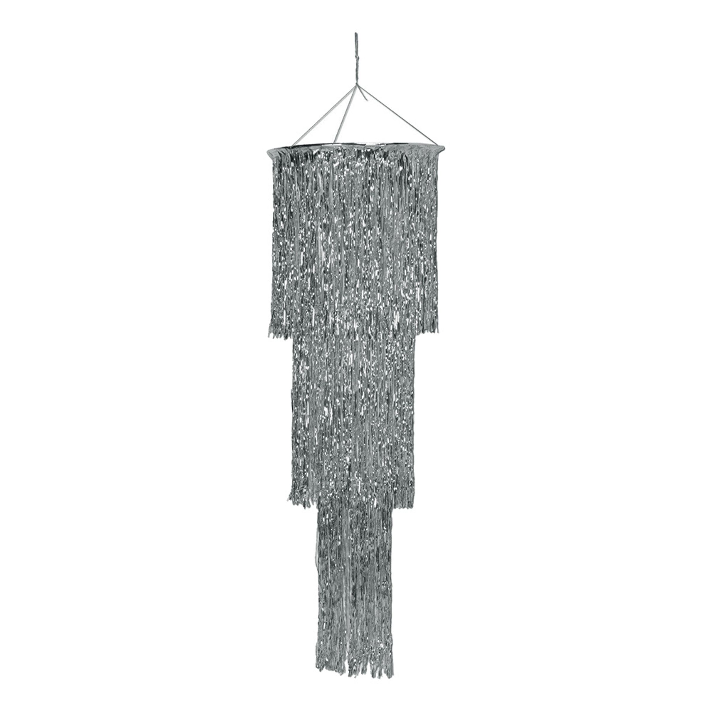 Hängande Ljuskrona Silver är en mycket vacker takdekoration som passar utmärkt att använda till bröllop, dop, födelsedagsfest eller nyårsafton. Dekorationen består av tre vågräta cirklar i olika storlekar som var och en är försedd med plastfolietrådar i gnistrande silver.