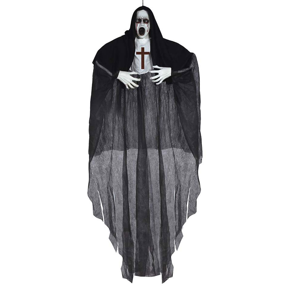 Hängande Nunna med Ljus 180 cm omfattar en hängande dekoration i form av en läskig nunna med huvud och armar, klädd i en svart dräkt. Dekorationen har inbyggda LED-lampor.