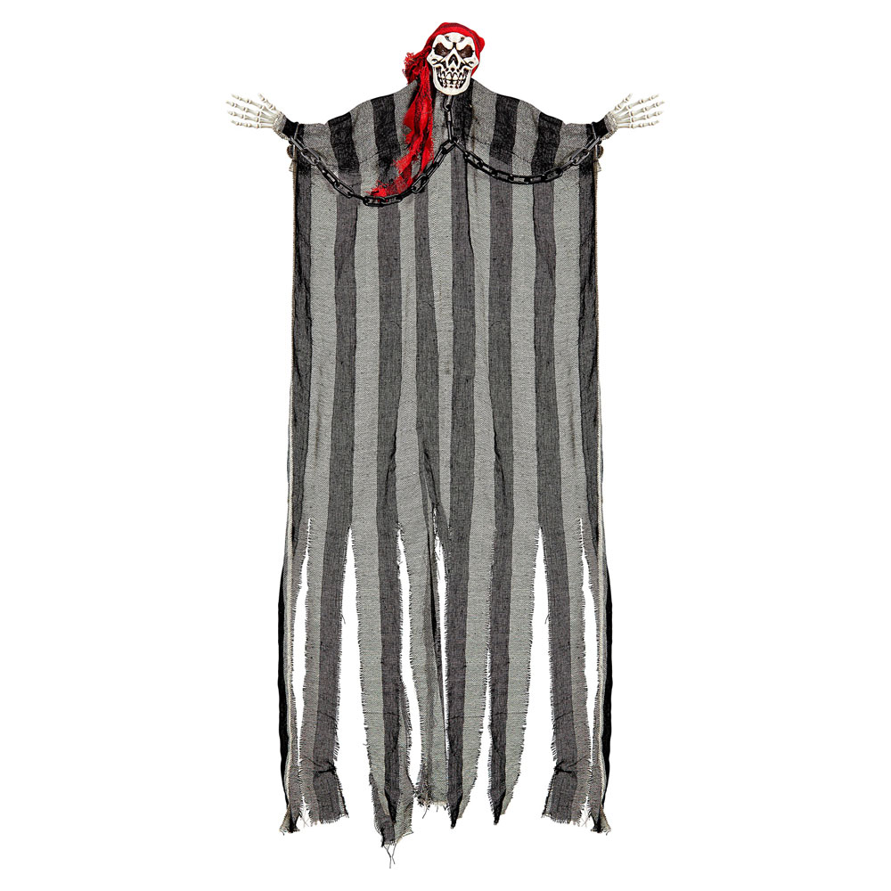 Hängande Piratskelett Dekoration omfattar en piratskelett dekoration med randig klädsel, röd bandana och kedjade händer. Dekorationen är ca 92 cm lång och är tillverkad av bomull, polyester och plast.