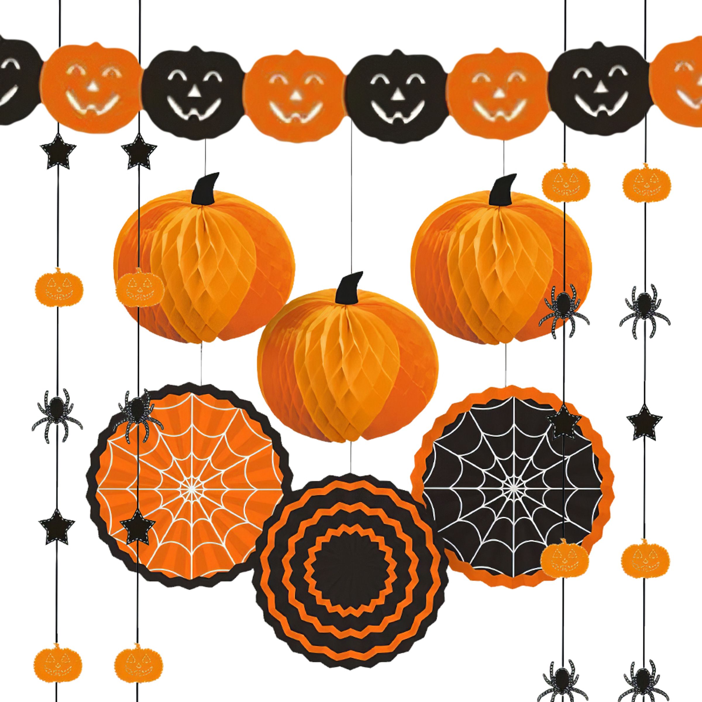 Ett perfekt kit för dig som vill ha allt på samma gång när det ska pyntas inför halloween! Här hittar du fjädrar, honeycombs, girlanger och hängande dekorationer på snöre – upp med allt och låt festen börja!