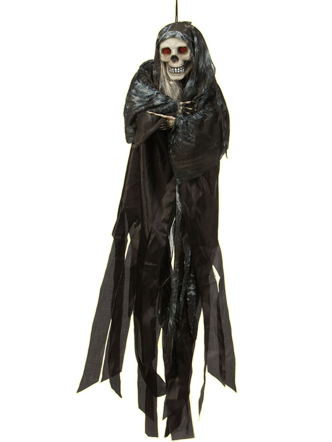 Hängande Reaper omfattar ett skelett med grått hår som bär på en svart robe och matchande huva, upphängningstråd medföljer.