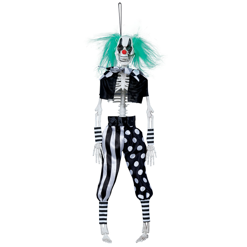 Hängande Skelett Clown omfattar en hängande dekoration i form av ett vitt skelett som är klätt i en svartvit dräkt med clownmotiv.