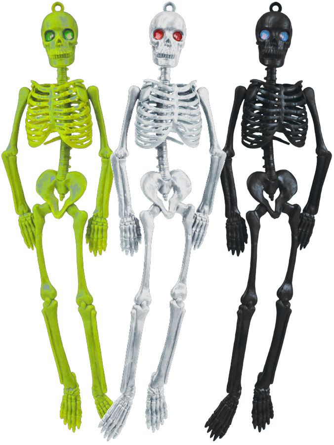 Hängande Skelett Dekorationer är tillverkade av plast och omfattar fyra skelett i färgerna grön, svart (2x) och vit. Skeletten har dessutom färgade ögon och kommer inklusive hänganordningar.