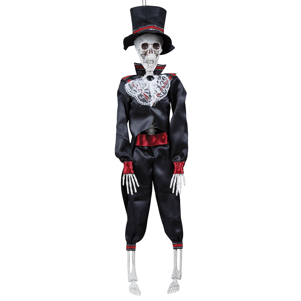 Hängande Skelett med Dräkt & Hatt omfattar en hängande dekoration i form av ett vitt skelett som är klätt i en dräkt och en hatt.