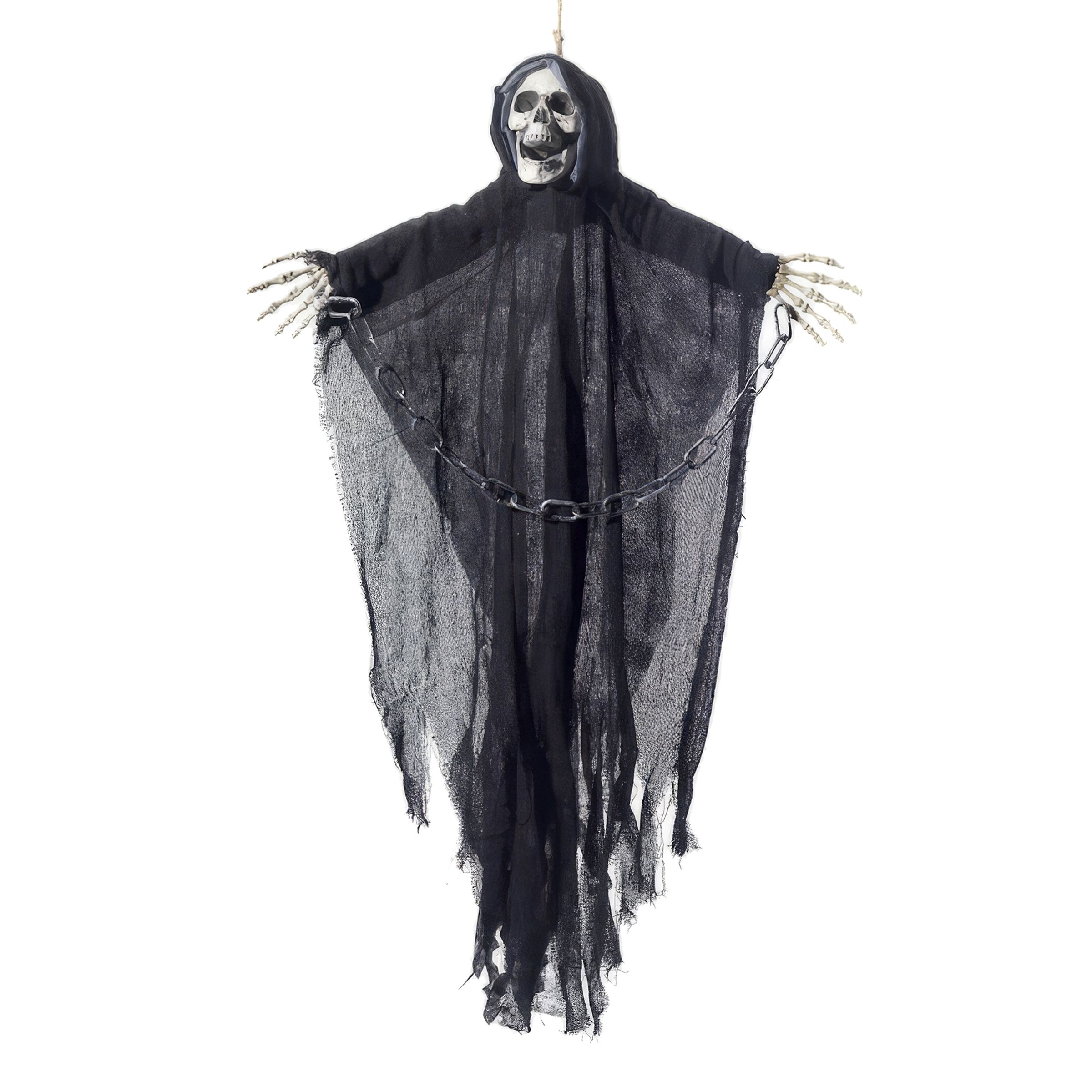 Hängande Skelett med Kedja består av en hängande dödskalle med skeletthänder och långt, svart tyg. Armarna är justerbara, och mellan händerna hänger en kedja av plast. Skrämmande som få! Bara att hänga upp på lämpligt ställe på din halloweenfest.