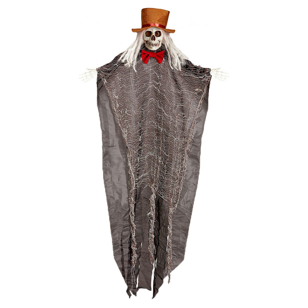 Hängande Skelett med Ljuseffekt Brudgum omfattar en ca 105 cm lång skelettdekoration i form av en brudgum med blinkande huvud. Dekorationen är tillverkad av bomull, plast och polyester och drivs av 3 st LR44-batterier.
