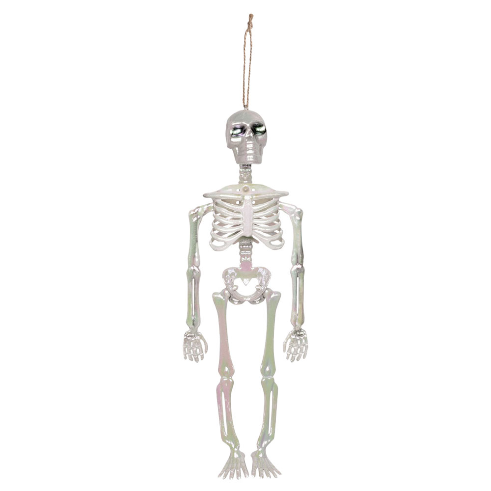 Hängande Skelett Silver omfattar en skimrande skelett dekoration i silver. Skelettet är i plast och mäter ca 32 cm lång.