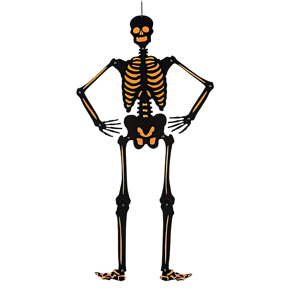 Skrämmande glittrigt skelett, perfekt dekoration för Halloween fest och kusliga kvällar. Ett både läskigt och snyggt hängande skelett, som blir ett kul pynt och läskig prydnad i Halloween tider. Skelettet är i svart med mörkt guldigt glitter, armar och ben är rörliga, med andra ord ett maxat Halloweenskelett som med fördel matchas med andra läskiga dekorationer och prydnader för mörka Halloween kvällar.