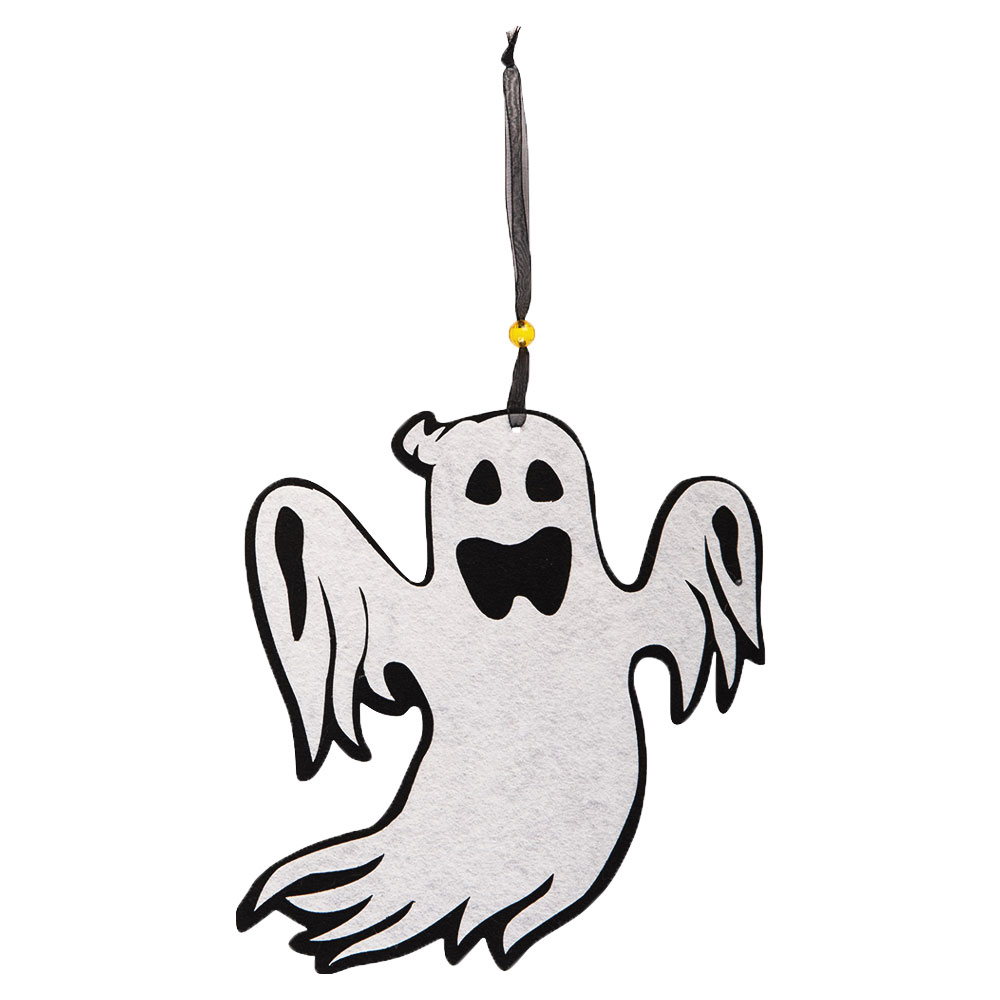 Hängande Spöke i Filt Liten omfattar en hängande dekoration föreställande ett vitt spöke på en svart bakgrund. Dekorationen är gjord i filtad polyester och är ca 20 cm lång utan och 33 cm lång med snöret.