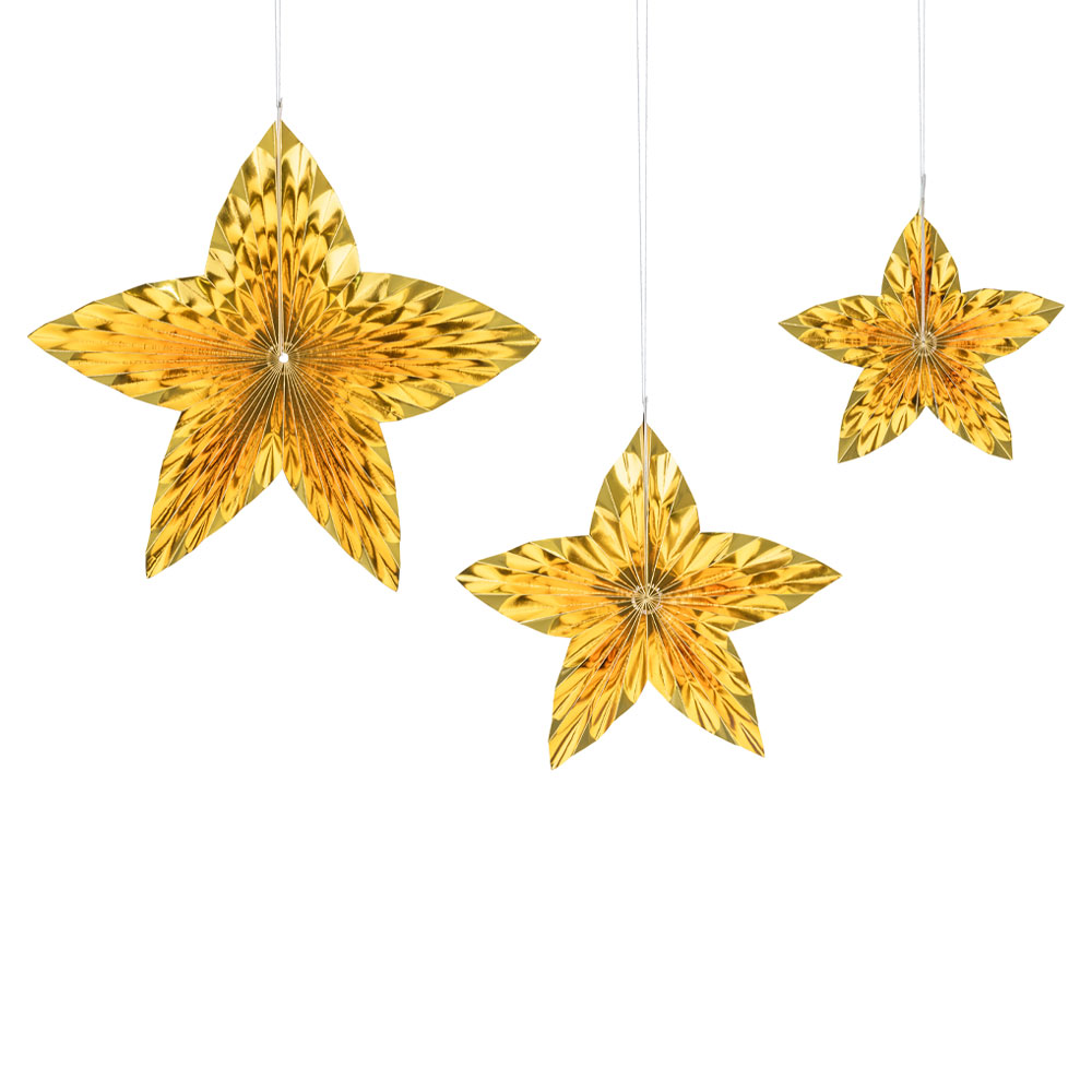 Hängande Stjärnor Guld omfattar tre st hängande dekorationsrosetter i form av guldiga stjärnor. Dekorationerna kommer i tre olika storlekar och mäter ca 24 cm, 32 cm och 40 cm i diameter. Tillverkade i papp och folie.
