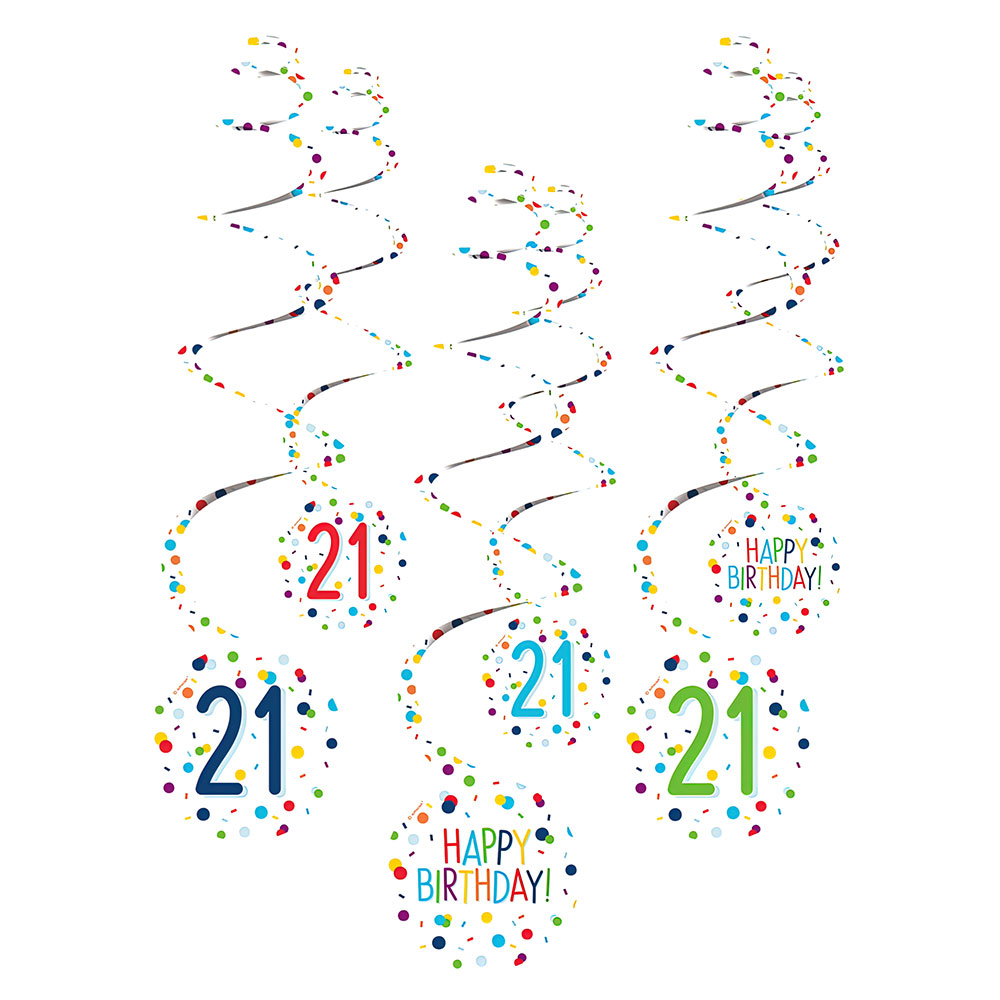 Hängande Swirls 21 år Confetti Birthday omfattar ett 6-pack hängande swirl dekorationer i vitt med färgglada konfettimotiv samt texterna "Happy Birthday" och "21". Dekorationerna är tillverkade av papp och är ca 61 cm långa. Dekorationerna har även små upphängningsöglor.