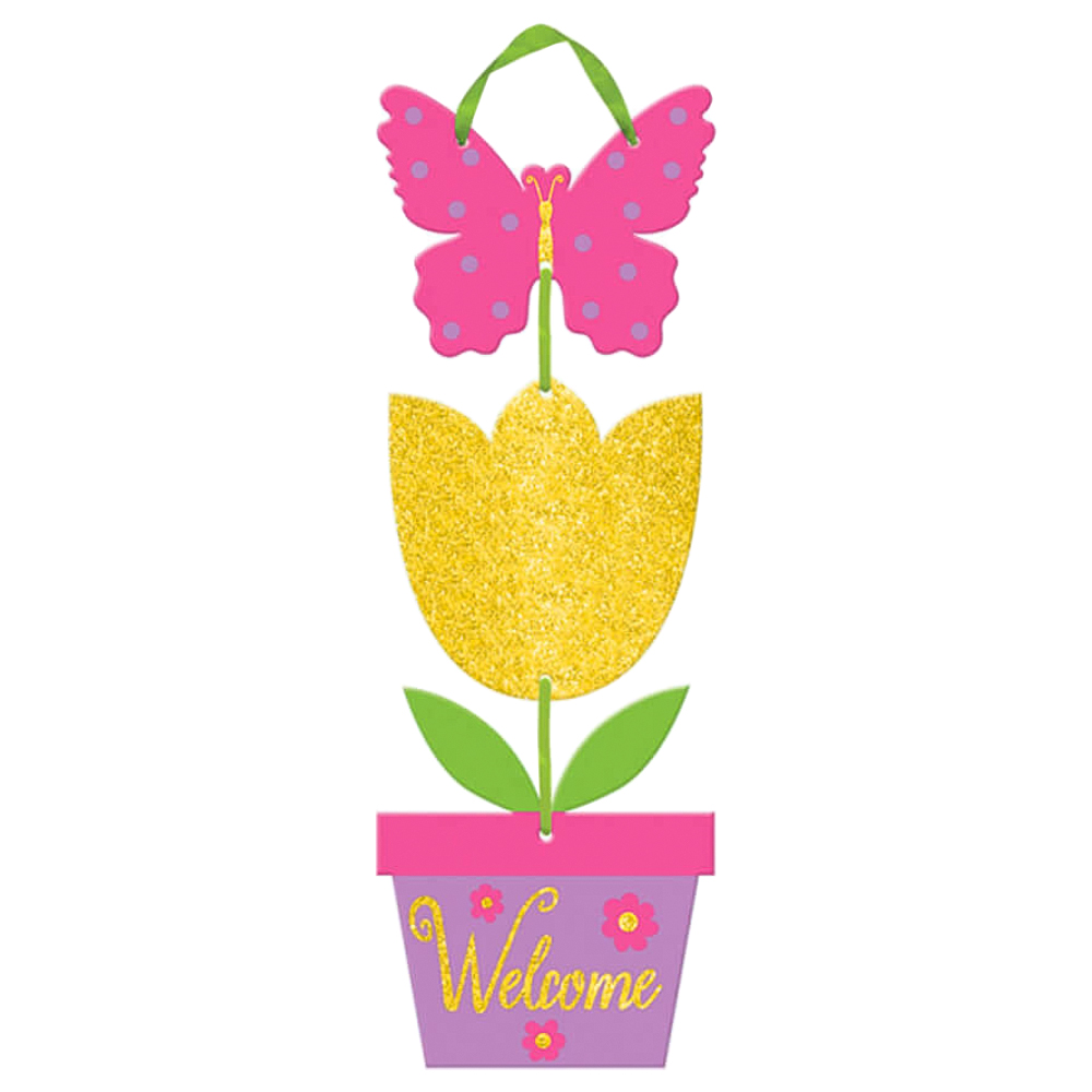 Hängande Trä Dekoration Welcome omfattar en hängande dekoration med tre delar i trä i form av en fjäril i rosa med lila prickar och gult glitter högst upp, en gulglittrig tulpan i mitten och kruka i lila och rosa med små blommor, gröna blad och "Welcome" text i gult glitter. Dekorationen hängs upp med limegrönt blankt band.