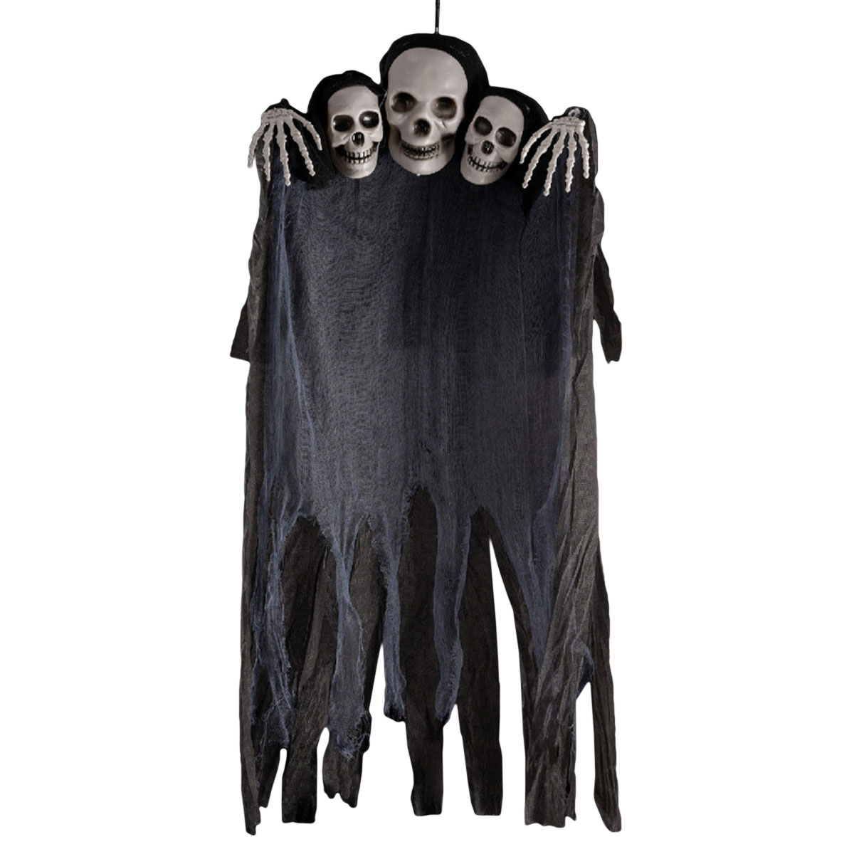 Inför årets spökfest, glöm inte att bjuda in ett iögonfallande hängande skelett. Denna hängande Halloween skelett-dekoration, med sin triss i grinande skallar och svajande svarta mantel, lovar att hänga med i svängarna och skrämma vettet ur dina gäster!