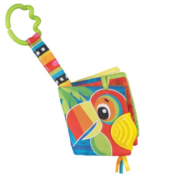 Hängande Tygbok Djungel omfattar en hängande färgglad tygbok med motiv av åtta djungeldjur, gul bitdel och pipljud. Boken har en grön krok för enkel upphängning.