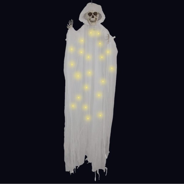 Förvandla ditt hem till en skrämmande plats med vår hängande Vitt Skelett med Lampa. Använd den som en del av din Halloween pyntning för att ge en överraskningsfaktor till dina gäster. Med böjbara skelettarmar, skeletthänder och en lykta, skapar den här skelett-dekorationen genast en skräckinjagande atmosfär. En idealisk halloween dekoration, det kommer definitivt att få ögonbryn att höjas. Batteridriven, denna halloween pynt kan placeras var som helst för maximal effekt.