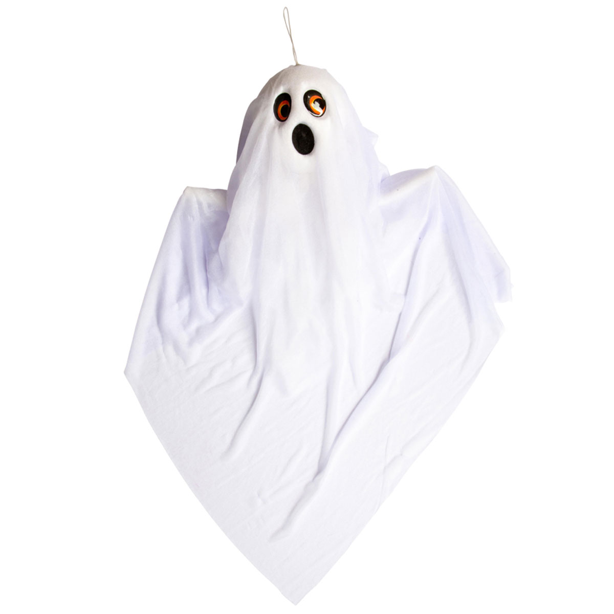 Hängande Vitt Spöke 70 cm omfattar en hängande dekoration i form av ett vitt spöke med orange ögon.