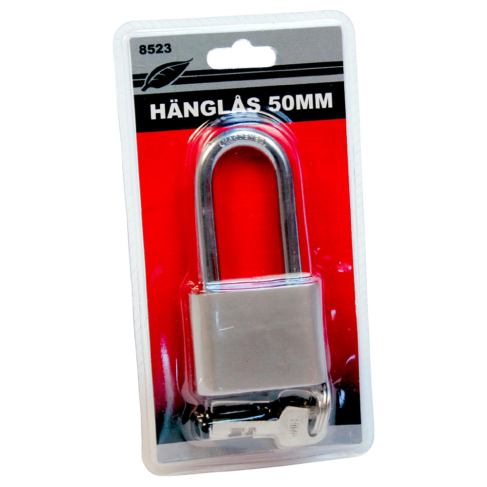 Hänglås 50 mm består av ett hängande lås med fyra stycken nycklar. Låsets bygel har ett innermått på nära 5 centimeter i höjd och 2,5 centimeter i bredd. Tillverkad av metall.