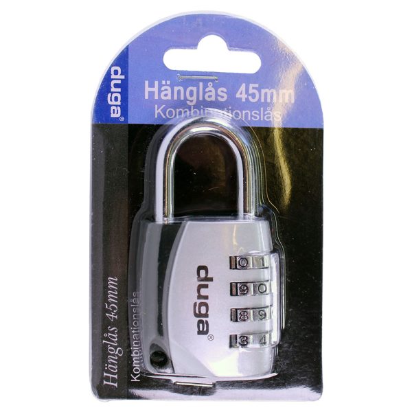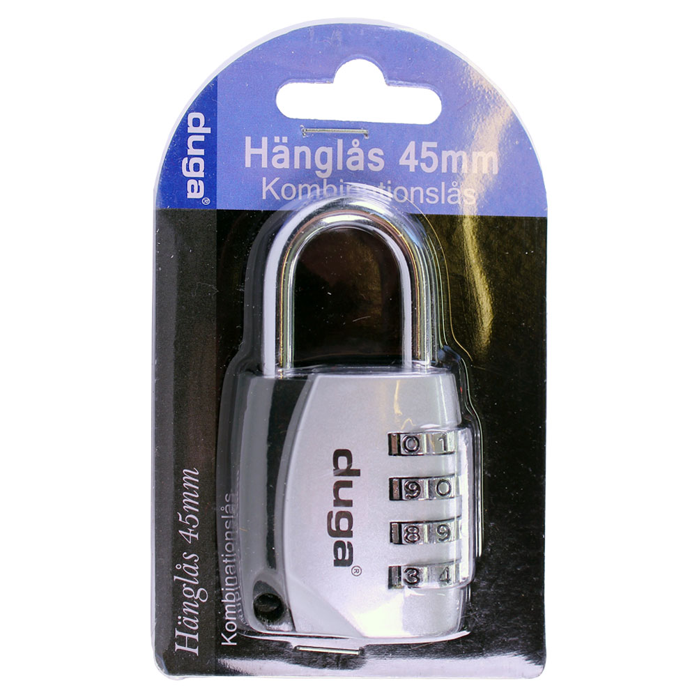 Hänglås med Kod 45 mm omfattar ett hänglås med kombinationslås med kod som kan ändras.Låset har en bygel i stål och är 45mm brett.