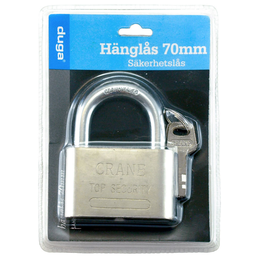 Ett stort och riktigt rejält hänglås av metall som låter dig låsa in dina prylar på ett tryggt och säkert sätt. Du får även med tre stycken tillhörande nycklar på en liten nyckelring som du kan låsa upp hänglåset med. Ett utmärkt hänglås för dig som söker ett passande lås till exempelvis förråd och liknande.