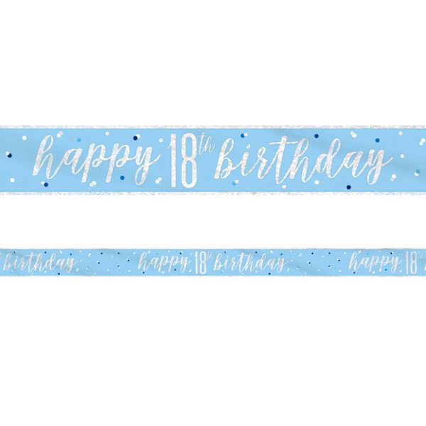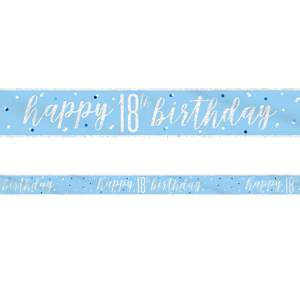 Happy 18th Birthday Banderoll Blå & Silver omfattar en banderoll i ljusblått med silvrig holografisk "Happy birthday" text och baksida samt motiv av prickar i blått, vitt och silver. Banderollen är tillverkad i tunn plast och är ca 13 cm hög och 2,74 meter lång.