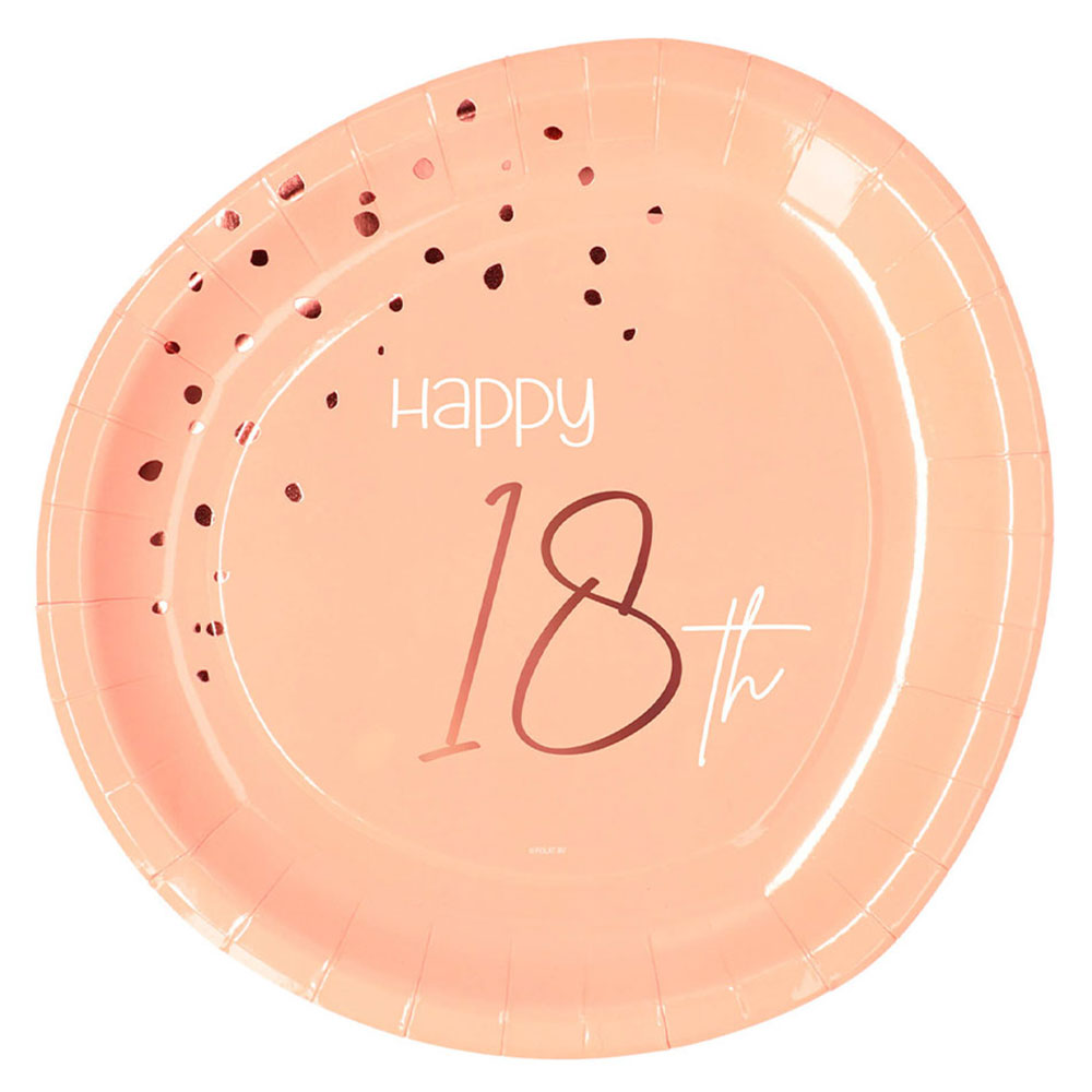 Fira den efterlängtade 18-årsdagen med ett härligt 18-års kalas och gör firandet extra snyggt med en fin fest dukning! Med hjälp av dessa tjusiga engångstallrikar i ljusrosa och roséguld kan du enkelt duka fram en riktigt festlig dukning till din 18-års fest. Super fina Happy 18th papperstallrikar som blir ett både snyggt och praktiskt tillbehör till varje 18-års dukning i ljusrosa.
